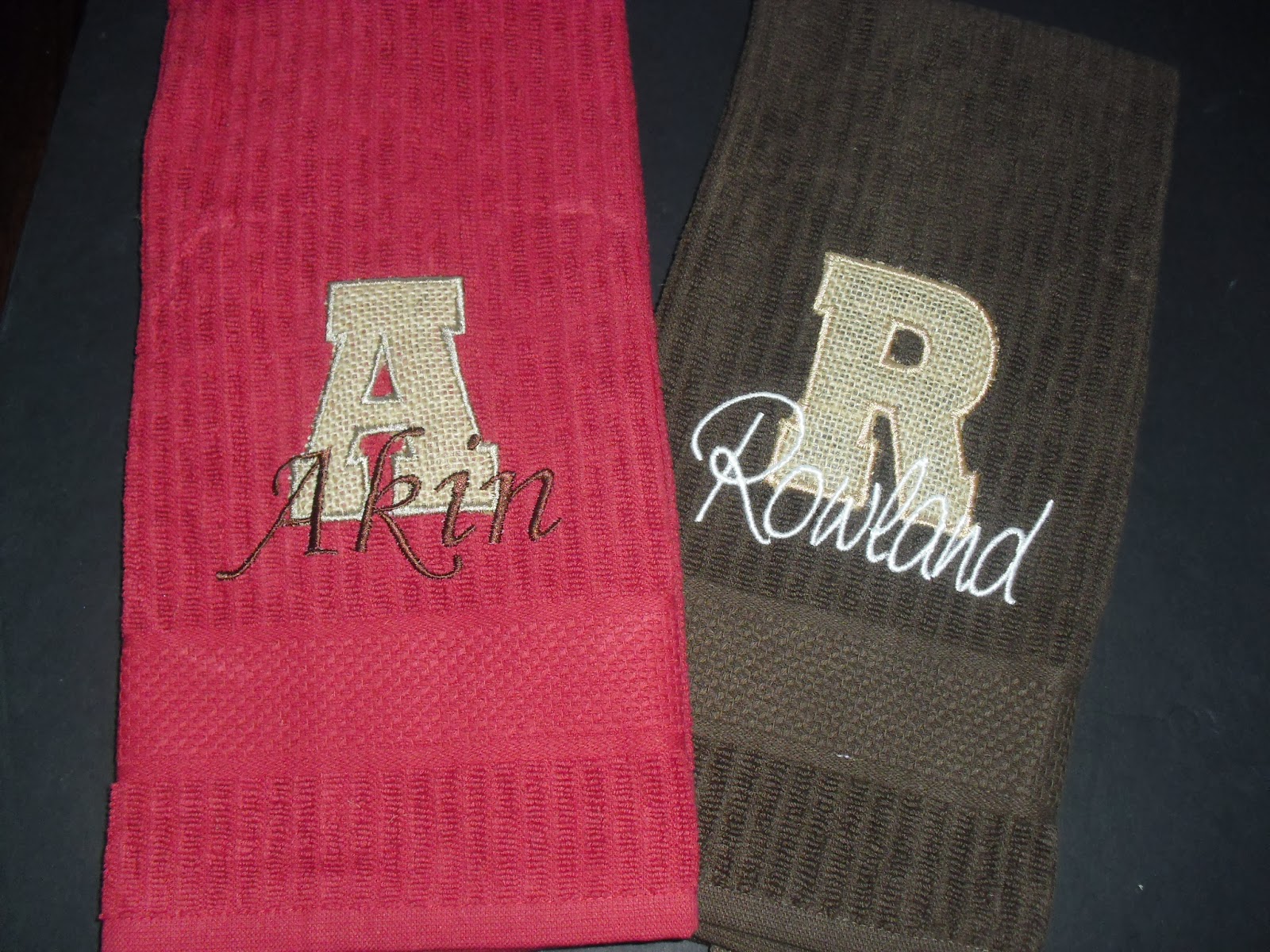 Kitchen and bath hand Towels are NEW to my collection as a great gift idea for just about anyone and even yourself! Hand or Bath towels can come in just about any color. Hand towels are $12-$14 each with applique and embroidery. Initial Letter can be done in any fabric including burlap.
